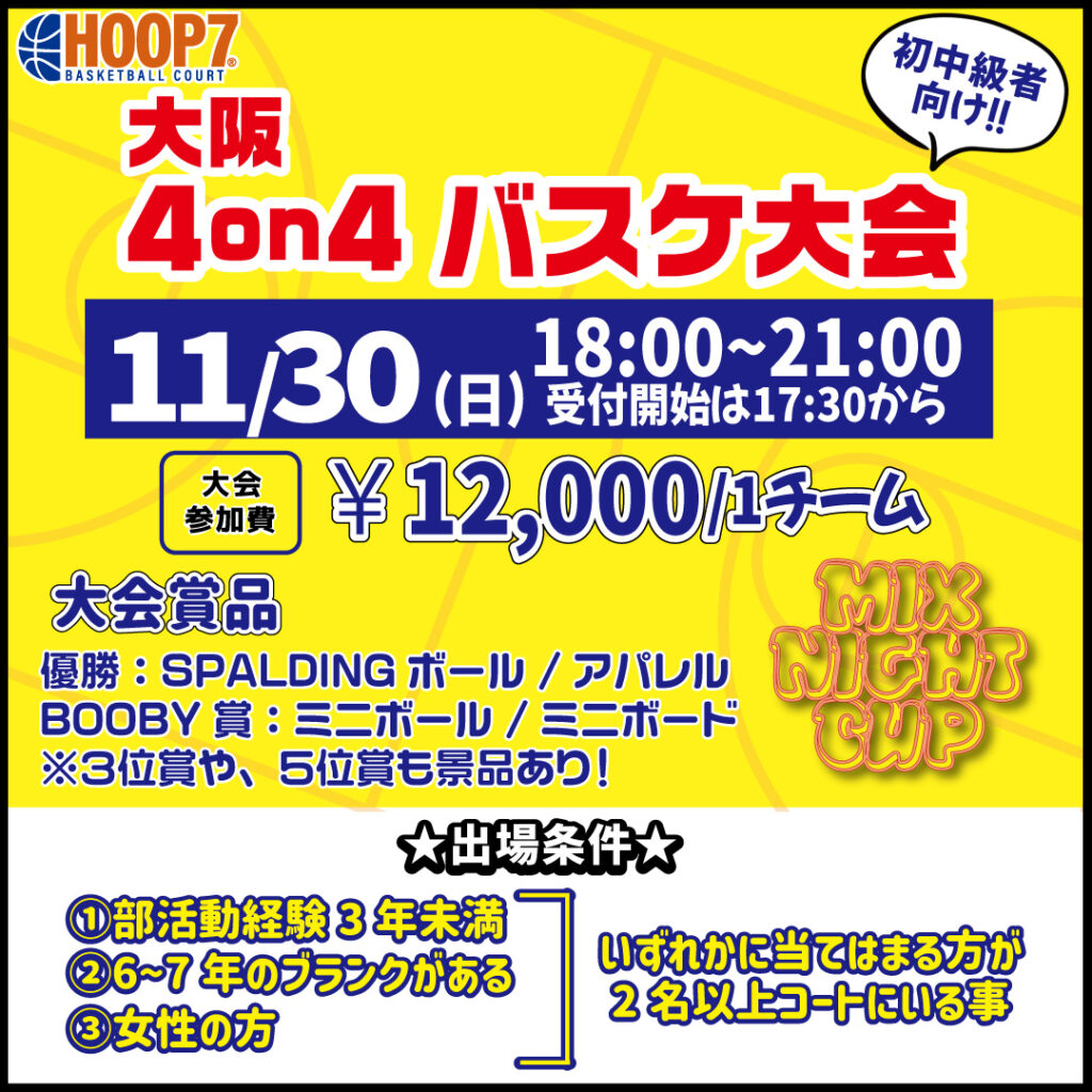 【東大阪店】11月30日(日) 日曜日18時~ 初中級者向け大会❗️エントリー開始❗️🏀